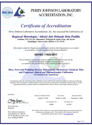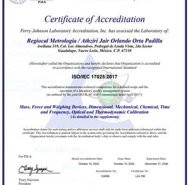 En Regiocal Metrología, nuestra certificación ISO/IEC 17025:2017, otorgada por Perry Johnson Laboratory Accreditation, garantiza que operamos bajo los más altos estándares de calidad y precisión en nuestros servicios. Este reconocimiento internacional confirma la confiabilidad de nuestros procesos y nuestro compromiso con la excelencia técnica, con el objetivo de cumplir siempre las expectativas de calidad y precisión de nuestros clientes.